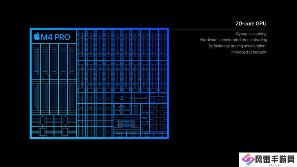图形处理器配备最多 20 颗核心,是 M4 芯片的 2 倍,带来强劲图形处理性能,比最新型 AI PC 芯片快最多可达 2.4 倍