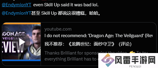 Skill Up是《龙腾世纪》忠实粉丝,在昨晚的评测视频中表示不推荐本作