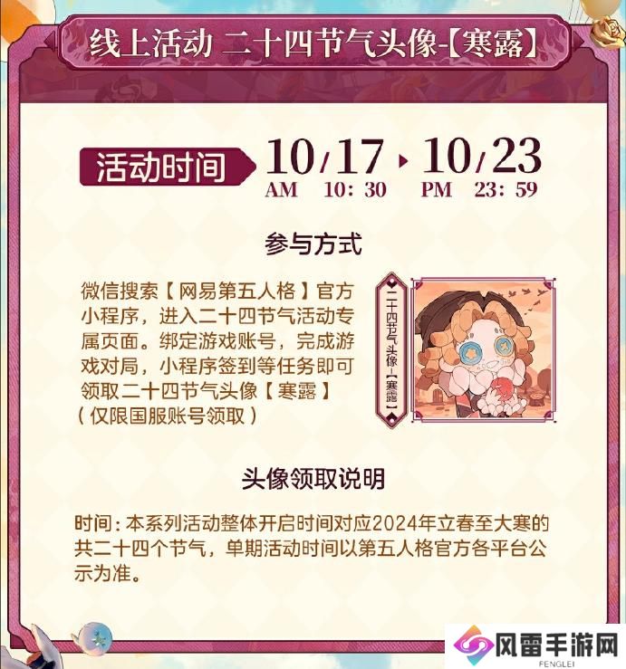 随着寒露线下活动的完美落幕,线上活动也在等待各位访客参与。寒露线上活动(10月17日至10月23日)将于【网易第五人格】官方小程序二十四节气活动专属页面内开展,访客们在完成绑定游戏账号,成游戏对局、小程序签到等任务后即可领取二十四节气头像-【寒露】。画面中,杂技演员手捧道具,正在广袤的黄土地上准备表演节目,高空中一队人字形大雁一路往南,他的表情若有所思,也许,他也该做好向南而去的准备……