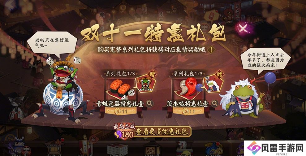 要素察觉!难道平安京有什么购物狂欢?扫地工顺着吆喝声望去,原来是青蛙瓷器和茨木哌听说最近现世掀起买买买风潮,于是决定紧跟现世潮流,争先开启双十一特惠礼包大放送,看看谁才是阴阳师销冠!