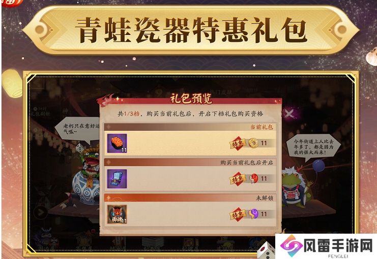 ※青蛙瓷器和茨木哌各带来了三款礼包,每购买一款礼包即可解锁下一款,大人可点击礼包预览查看全部礼包~