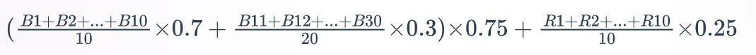 评价值与“历史最佳表现”中单谱评价最高的30份谱面(简称B30,不可重复)及“近期表现”的30份谱面中单谱评价最高的10份谱面(简称R10,可重复)相关。