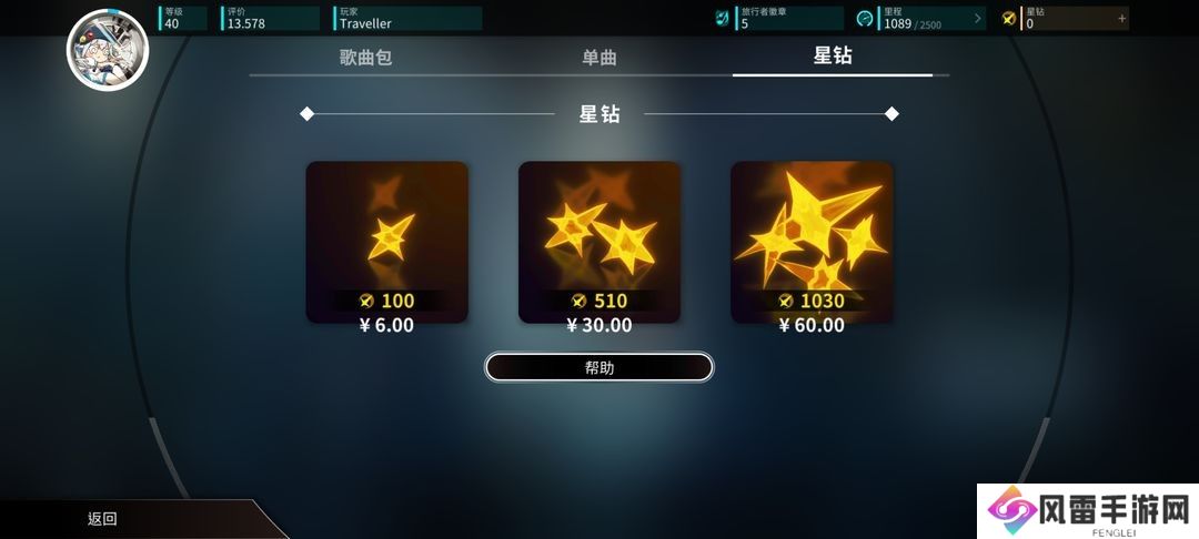 在游戏内购买歌曲需要充值星钻,游戏提供了三个档次,如图所示