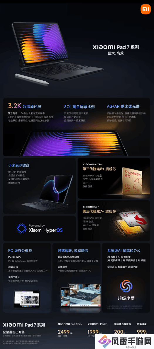 小米平板 7 系列还将拥有全局 AI 智能助手;并搭配小米澎湃 OS 2,支持 PC 级多任务处理、PC 级 WPS 和 CAJViewer;可以打开 Keynote、Pages 等苹果办公套件。