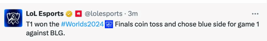 据《英雄联盟》官方消息,T1通过抛硬币的胜利获得2024《英雄联盟》全球总决赛决赛第一局选边权,并选择蓝色方。