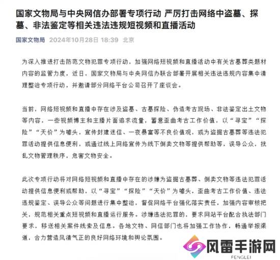 国家文物局10月28日发文表示,近日与中央网信办联合部署开展相关违法违规内容集中清理整治专项行动,将加强网络短视频和直播活动中有关古墓葬类题材内容的监管力度。