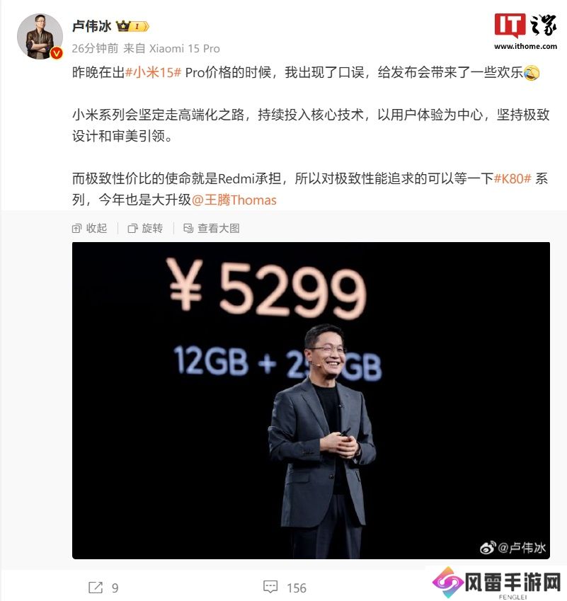 本站 10 月 30 日消息,今天上午,小米集团合伙人、总裁、手机部总裁卢伟冰在微博上发文称:“昨晚在出小米 15 Pro 价格的时候,我出现了口误,给发布会带来了一些欢乐。”