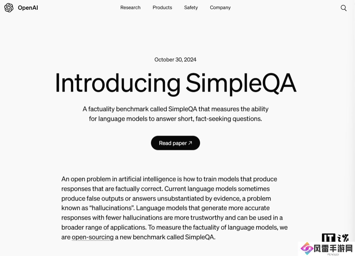 本站 10 月 31 日消息,当地时间 30 日,OpenAI 宣布,为了衡量语言模型的准确性,将开源一个名为 SimpleQA 的新基准,可衡量语言模型回答简短的事实寻求(fact-seeking)问题的能力。
