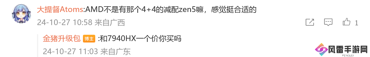 AMD 处理器游戏本阵营也是类似情况,Zen 4 架构处理器搭配新英伟达显卡更为经济实惠。博主在回复中提到,4×Zen5 + 4×Zen5c 设计的 Kra(c)ken Point 同 16×Zen4 的锐龙9 7940HX 定价相当。