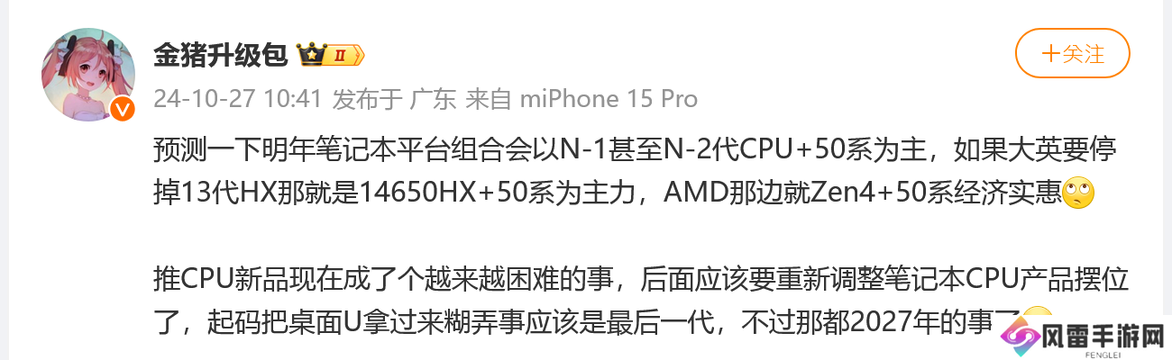 本站 10 月 29 日消息,微博用户 @金猪升级包 本月 27 日预测,由于移动端新一代处理器推广困难加剧,2025 年独显笔记本(本站注:大致相当于游戏本)平台组合将会以英特尔、AMD 的 N-1 甚至 N-2 代 CPU 搭配英伟达 GeForce RTX 50 系独显为主。