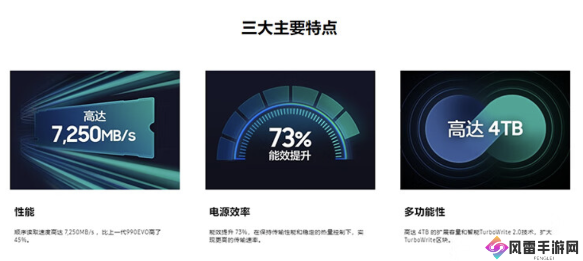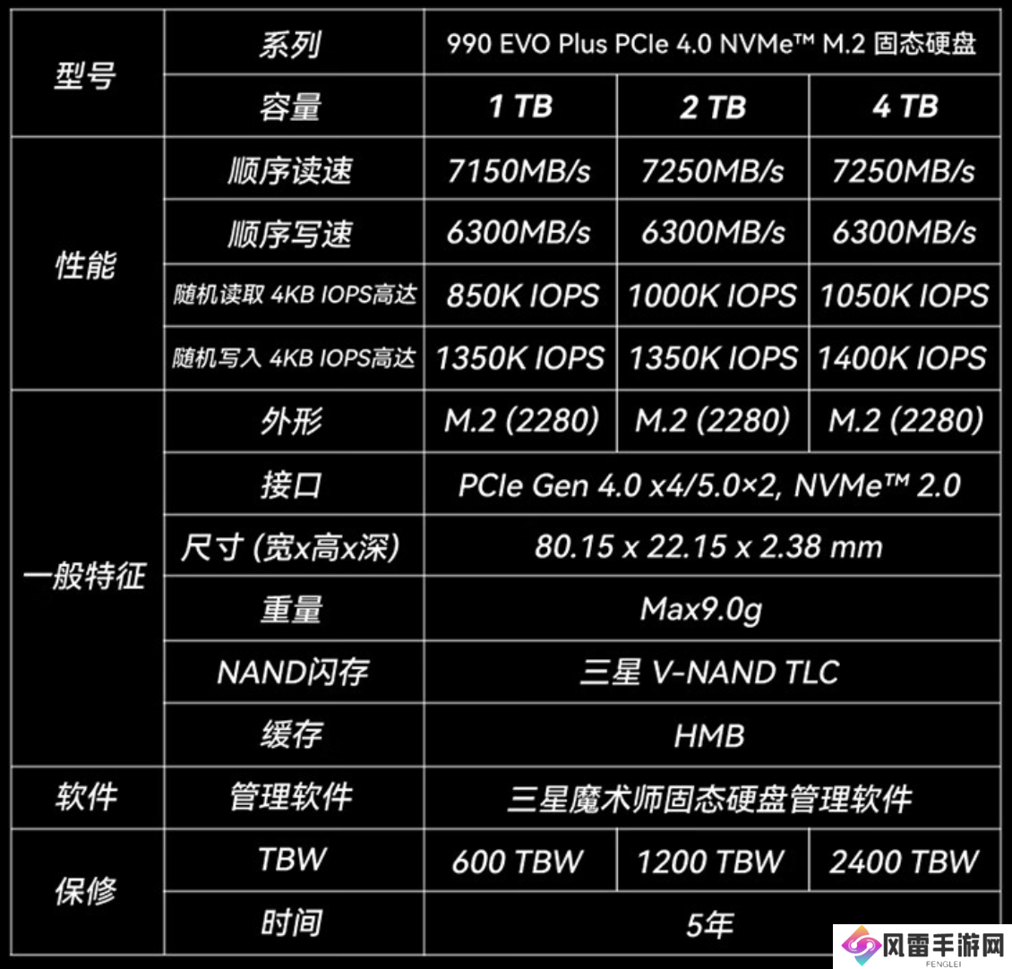 据介绍,这款固态硬盘整体尺寸80.15 x 22.15 x 2.38mm,采用 PCle4.0 x4/5.0x2 接口,其支持 TurboWrite2.0 智能技术,随机写入 1350K IOPS,其顺序读取写入速度信息如下: