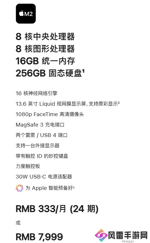 M2MacBook Air:8 核心 CPU+8 核心 GPU,16GB+256GB,7999 元,教育优惠 7199 元
