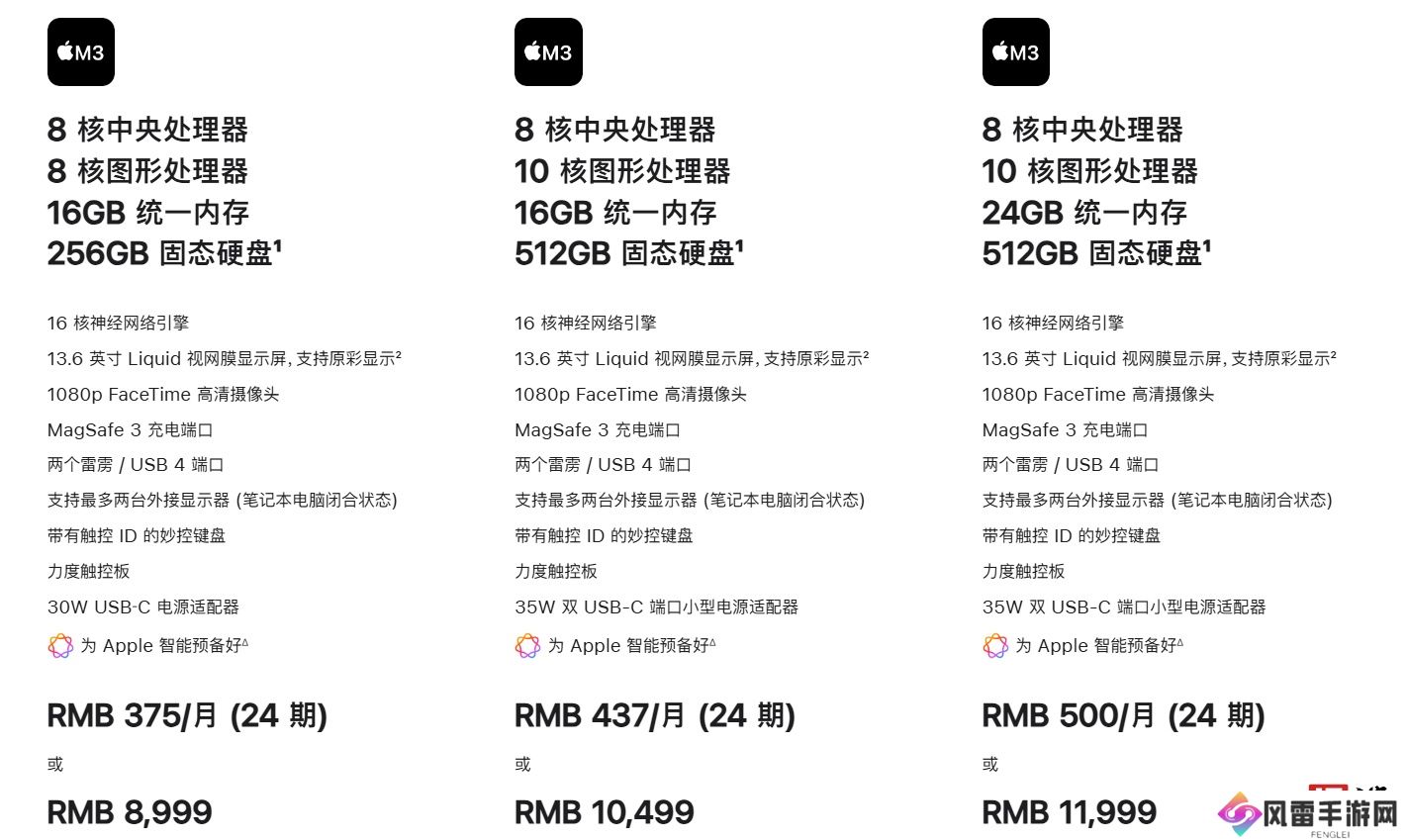 M3 MacBook Air:8 核心 CPU+10 核心 GPU,24GB+512GB,11999 元,教育优惠 11199 元