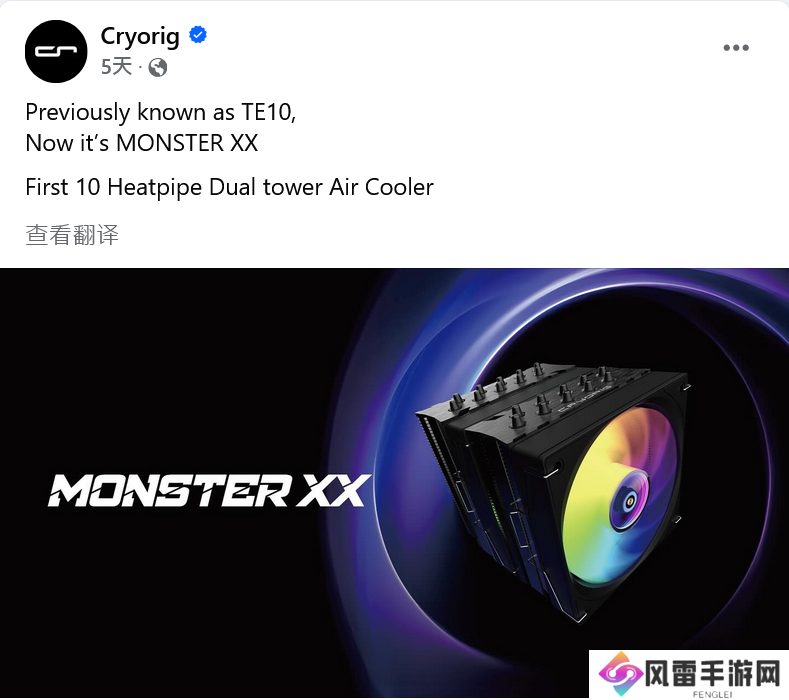 快睿推出 10 热管风冷散热器 MONSTER XX,标称散热功耗 300W
