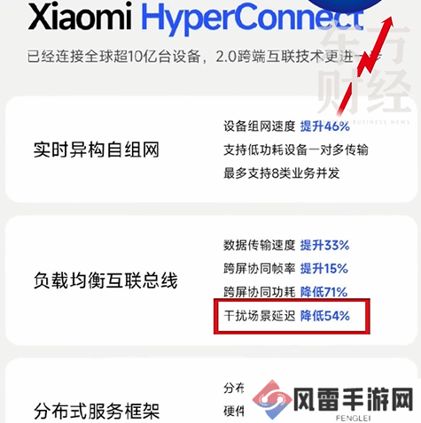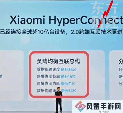 东方财经对比了小米澎湃OS官微发布的海报,发现同位置文案为“干扰场景延迟降低54%”。由此来看,发布会PPT应该是出现了书写错误,将“干扰场景延迟降低”写为“数据传输速度”,导致PPT上出现重复。
