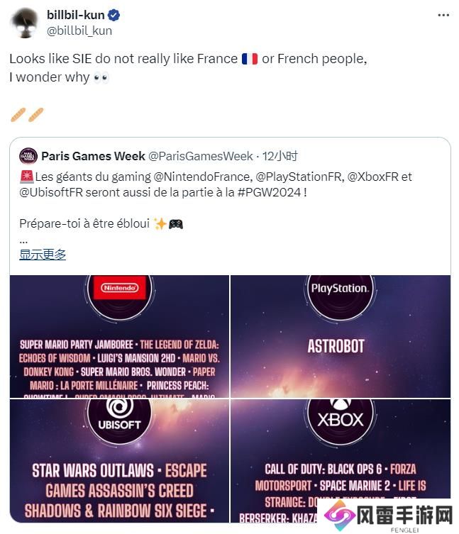知名法国爆料人billbil-kun也转发了该消息,并说道:“看起来SIE不喜欢法国或者法国人,我不知道为什么”。