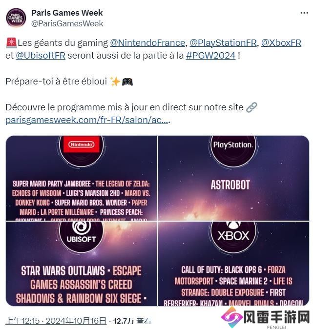 10月16日,巴黎游戏周(简称PGW)宣布“主机御三家”和育碧都将参与今年的展览活动,这是一场每年一度在法国巴黎巴黎凡尔赛门展览馆举行的电子游戏贸易展览会,今年将在10月23日至10月27日期间举办。
