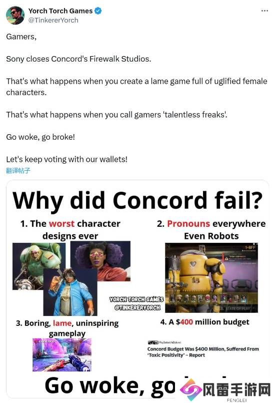 推主@TinkererYorch 呼吁玩家坚持下去,继续用自己口袋里的钱投票:“这就是当你称玩家为‘没有天赋的怪胎’时就会发生的事,觉醒然后去破产,让我们继续用钱包投票!”