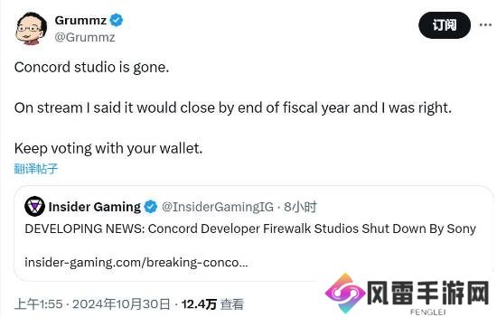 而知名反ZZZQ人士,前暴雪制作人Grummz也发推表示:“《星鸣特攻》工作室完犊子了,在直播中我就说过它会在本财年就关闭,我是对的。继续用你们的钱包投票!”