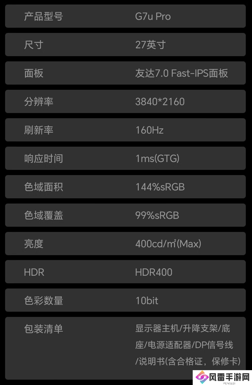 4K 160Hz 友达 Fast-IPS 面板:盛色 G7u Pro 27 英寸显示器 1379 元新低