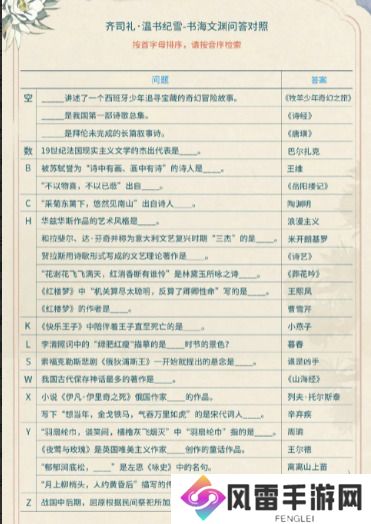 光与夜之恋温书纪雪答案大全1、讲述了一个西班牙少年追寻宝藏的奇幻冒险故事的是?答案: 《牧羊少年奇幻之旅》;2、哪一部是我国第一部诗歌总集?答案:《诗经》;3、哪一部是拜伦未完成的长篇叙事诗?答案: 《唐璜》;4、19世纪法国现实主义文学的杰出代表是?答案:巴尔扎克;5、被苏轼誉为“诗中有画、画中有诗”的诗人是?答案:王维;6、“不以物喜,不以已悲”出自?答案:《岳阳楼记》;7、“采菊东篱下,悠然见南山”出自诗人?答案: 陶渊明;8、华兹华斯作品的艺术风格是?答案:浪漫主义;
