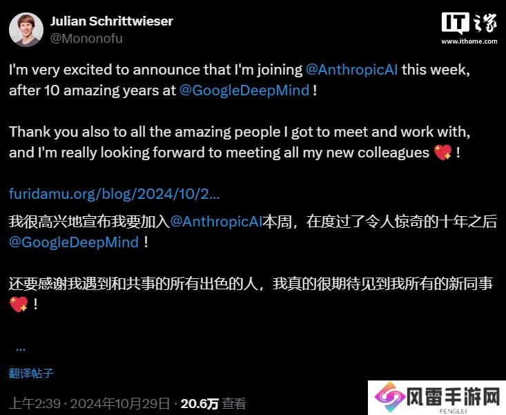 本站 10 月 30 日消息,谷歌 DeepMind 顶尖研究员 Julian Schrittwieser(朱利安・施特维泽)10 月 29 日宣布加入 AI 公司 Anthropic。
