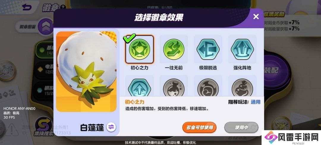 建议大家的首选徽章是蓄电待发,因为这个徽章只要你在原地不动超过4秒钟以后就可以让移速大大提升,在草团滚滚赛中,移速是最重要的,因为你只有移速快才能在别人到达大量蛋区域前到达,从而获得更多的蛋。