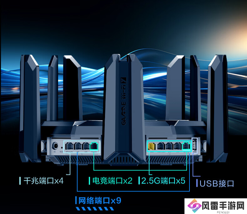 这款路由器号称“999 真旗舰”,即 9 根天线、9 颗 FEM、9 网口,速率可达 7200Mbps,可覆盖 121-200m² 的面积。