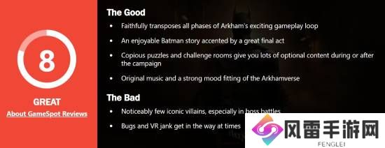 蝙蝠侠VR游戏《蝙蝠侠:阿卡姆之影》在不久前发售,GameSpot给本作打出了8分的评价。评测者表示,本作虽然无法比肩Rocksteady打造的蝙蝠侠主线故事,但体验起来依然非常优秀,如果你有VR设备而且是蝙蝠侠粉丝,本作可以说是必玩游戏。