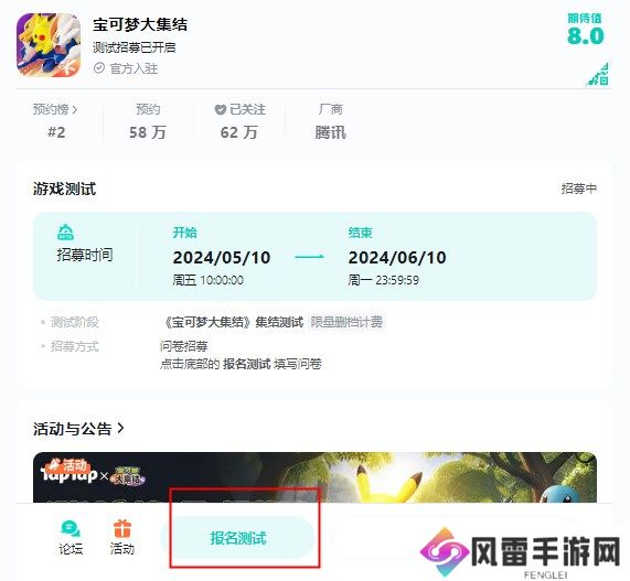 《宝可梦大集结》集结测试参与方法1、首先复制链接【https://www.taptap.cn/app/193791】到浏览器中粘贴并跳转,点击左侧的【报名测试】就可以参与测试中。
