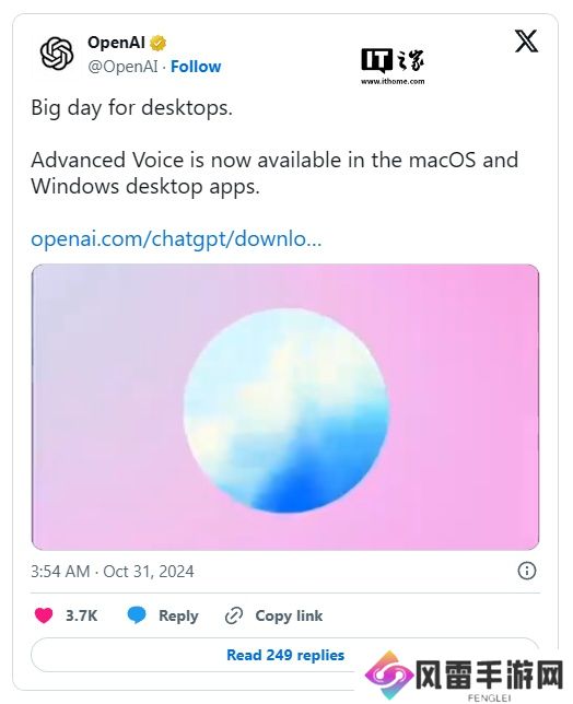 本站 10 月 31 日消息,OpenAI 今日宣布,ChatGPT 的高级语音模式(Advanced Voice Mode,简称 AVM)现已登陆 Windows 和 Mac 平台。
