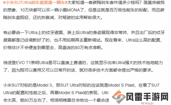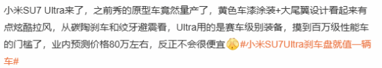 该配置引发网友热议,有网友对小米在汽车领域的进步给予肯定,称采用碳陶刹车盘如果售价再更具性价比一些,那么小米SU7 Ultra会在竞争激烈的市场中获得优势。