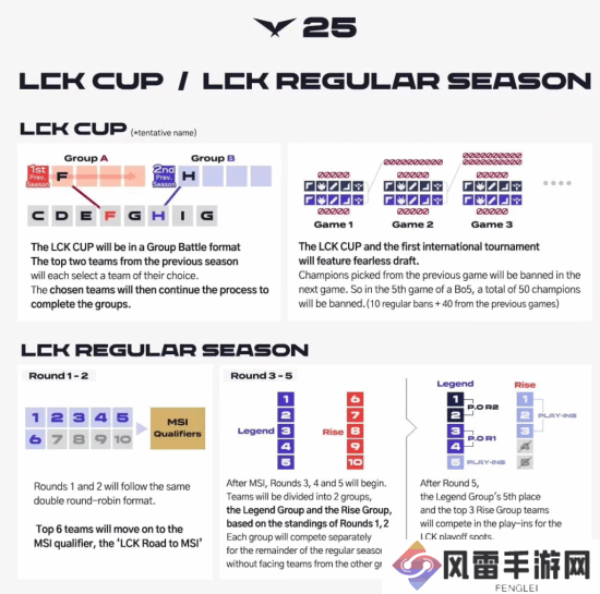 根据官方发布的公告,明年LCK将取消春/秋季赛,常规赛分为5轮进行,第二轮比赛结束后排名1至6为的队伍将竞争MSI的参赛资格。从常规赛第三轮开始,根据前两轮的成绩将队伍分为Legend组(前五名)和Rise组(后5名)。五轮比赛结束后Legend组前四直接进入季后赛,第五名与Rise组前三名将进行季后赛入围赛,最终根据决出进军世界赛的资格。