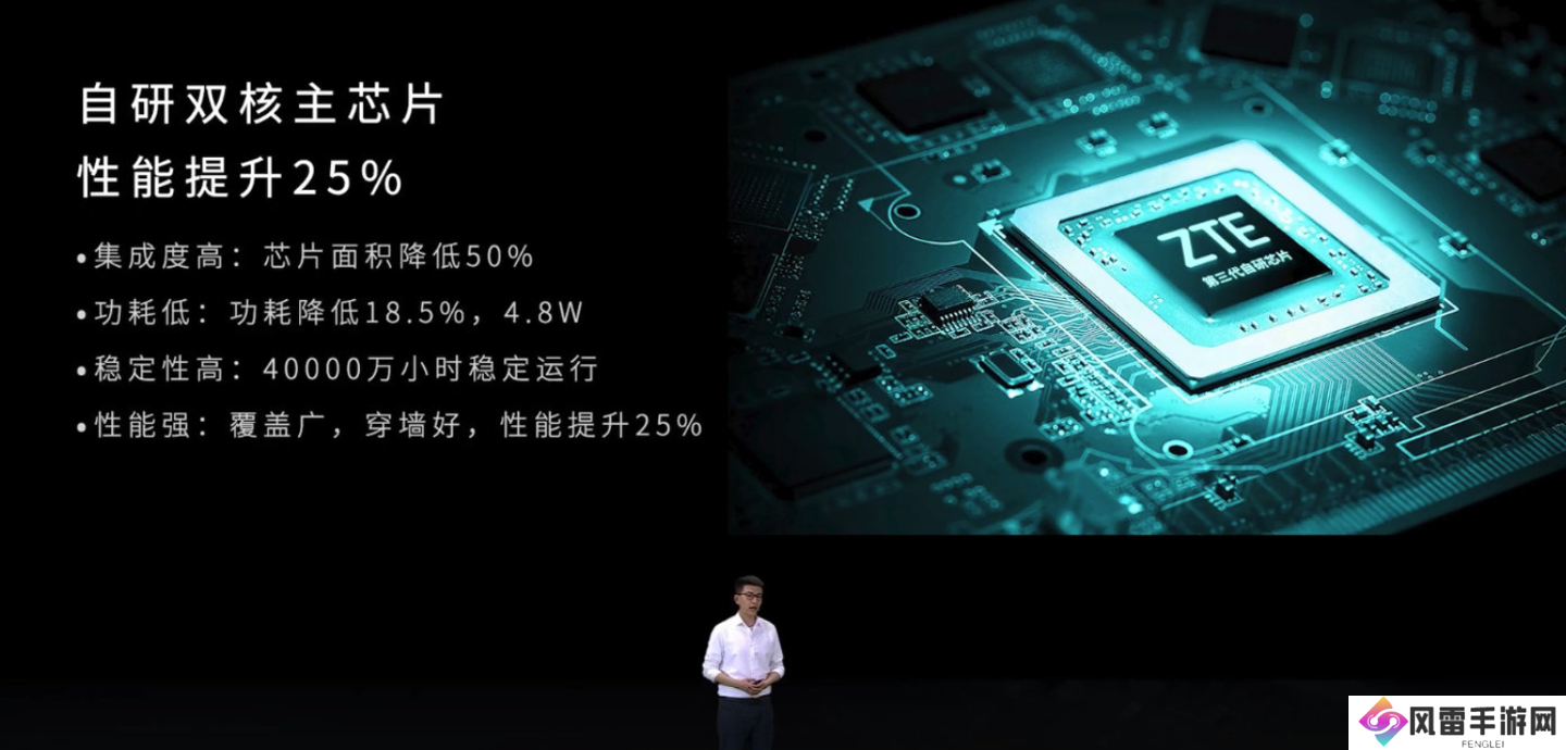 中兴 AX 3000 巡天版路由器搭载中兴第三代自研双核主芯片,性能提升 25%,功耗低至 4.8W,可 40000 小时稳定运行。