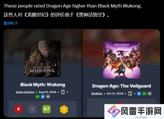 外网比较IGN《黑神话》《龙腾4》评分:这不合理!