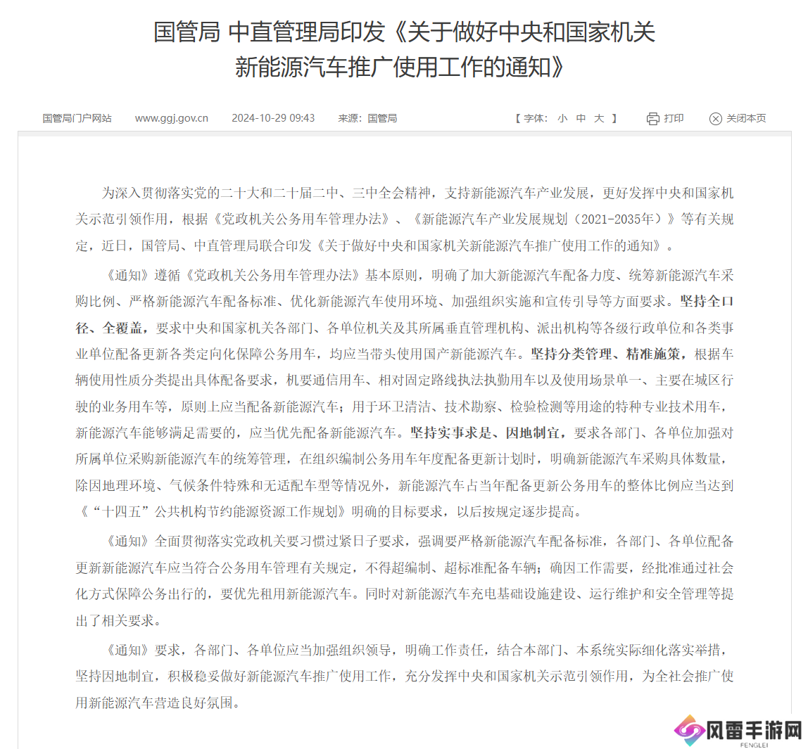 通知内容主要包括:各部门、各单位配备更新各类定向化保障公务用车,应当带头使用国产新能源汽车。