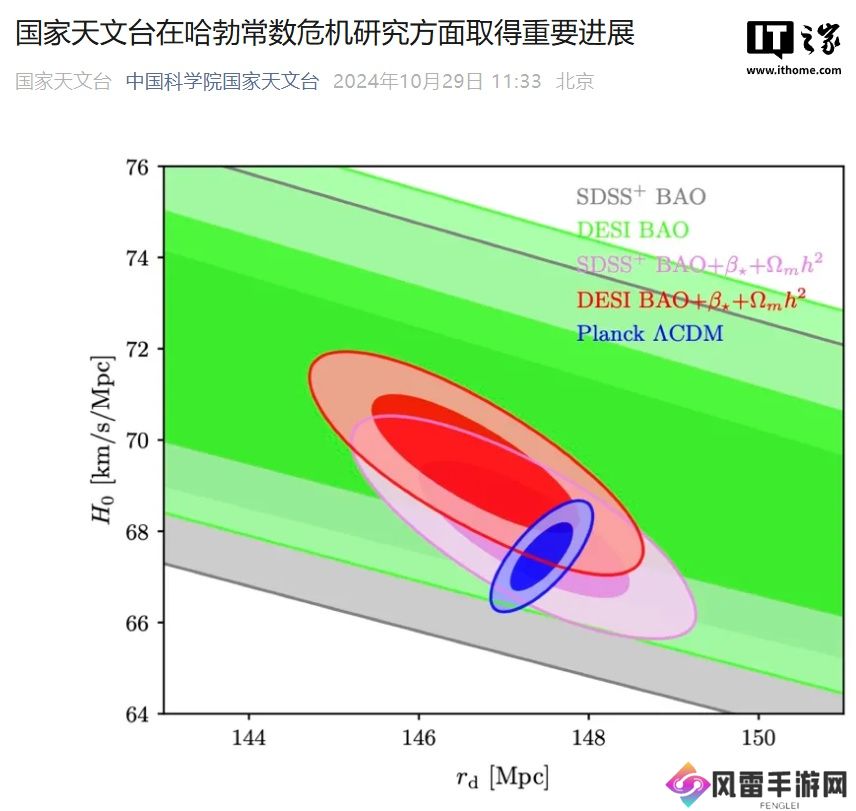 本站 10 月 29 日消息,据中国科学院国家天文台官方今日消息,近期,国家天文台赵公博研究员与加拿大和法国科学家合作,基于最新的暗能量光谱巡天(DESI)第一年观测数据,在不假设宇宙学模型的前提下,利用新方法,分别得到了 H0 和 rd 的限制。此研究发现,结合 DESI 和 Planck 观测数据,标准宇宙学模型仍然面临“哈勃常数危机”。这再次表明很可能存在超出标准模型的新物理。
