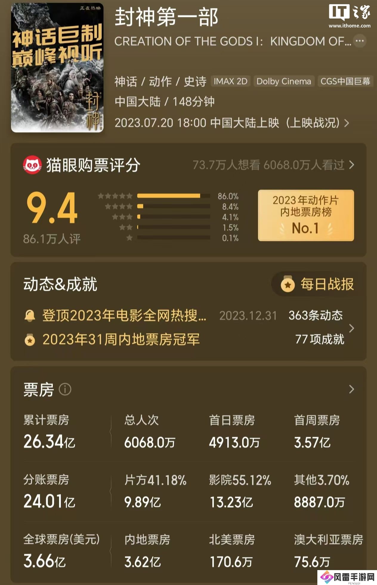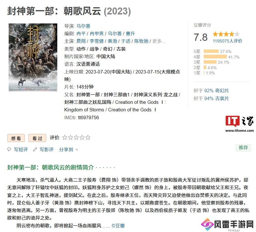 《封神第一部》上映于去年7 月 20 日,目前豆瓣评分 7.8、内地累计票房 26.34 亿,由乌尔善执导,费翔、李雪健、黄渤、于适、陈牧驰、此沙、武亚凡、夏雨、袁泉、王洛勇、侯雯元、黄曦彦、李昀锐、杨玏以及陈坤出演。影片讲述了: