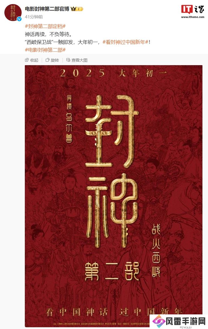 本站 10 月 29 日消息,奇幻电影《封神第二部:战火西岐》今日官宣定档 2025 大年初一(即明年 1 月 29 日)上映,继续由第一部导演乌尔善执导,影片首张海报现已公布。
