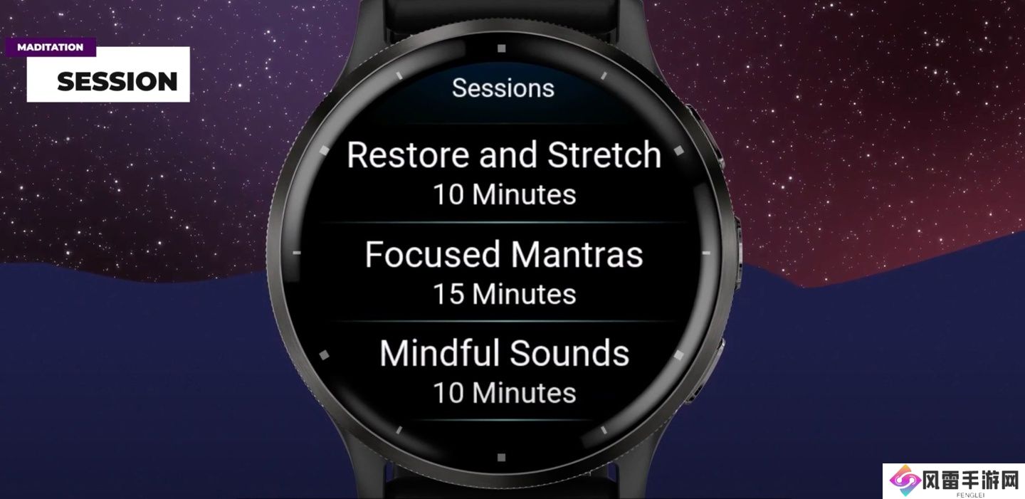 会话模式:包含由 Garmin 预设的主题,如“恢复与拉伸”、“专注的口号”和“正念声音”。