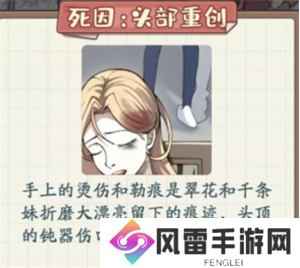 手上的烫伤和勒痕是翠花和千条妹折磨大漂亮留下的痕迹,头顶的钝器伤口才是致命伤。