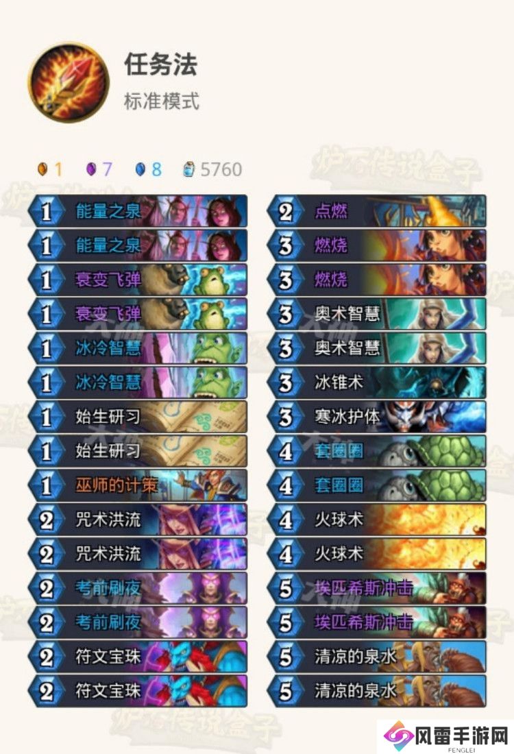 整套卡组40张的话,去掉传统的任务体系和必带的泉水之后,其实还有很多的卡位可以选择,如果要选择奥系的话,应该是差不多9张均的,但是能用的卡不多,而且要考虑到没有的卡存在,真正硬凑的话只会让自己卡手,打的更加难受的,可以调整的空间还是不少的。推荐带一些可以过牌的,比较高质量的卡位,根据环境灵活调整,这样可以调整到牌位更多;毕竟起手留牌一定要有奥,但是警惕带双洪流,很容易干扰到任务的问题,可以换掉多余的,哪怕是泉水也是可以的,后手也有硬币。主要是起手的话,洪流容易跟不上过牌,被快攻骑脸打死,卡手的可能性。而且核心是做任务,如果没法更好过牌的话,就又不好做任务了。理论上冰火奥三系带够的话,多余的想带过牌都行的,不一定的;按照目前最新环境的话,贼有不少快乐的,如果不打狂野模式,只打标准,其实可以不管那么多。正常来讲奥法只要不是遇到同类型的替身还是挺好解场的,或多或少的解场牌,都可以帮忙做任务;任务法的强度是母庸质疑的,而且打出之后更是可以轻松取胜了,可惜目前有一个问题就是卡7费如果可以在8费之前完成的话算比较厉害了,毕竟永久加3的实力,可是不可小看的。火焰也是有一张很有意思的,点燃可以无限疲劳,解场打脸都可以,重复做任务更是OK。不过印象后续的洗牌,带1张还是够了吧,看个人的喜好决定多少。暴雪式平衡也就这样了,难怪OW都没人为了,还好炉石有酒馆战旗,勉勉强强还可以。
