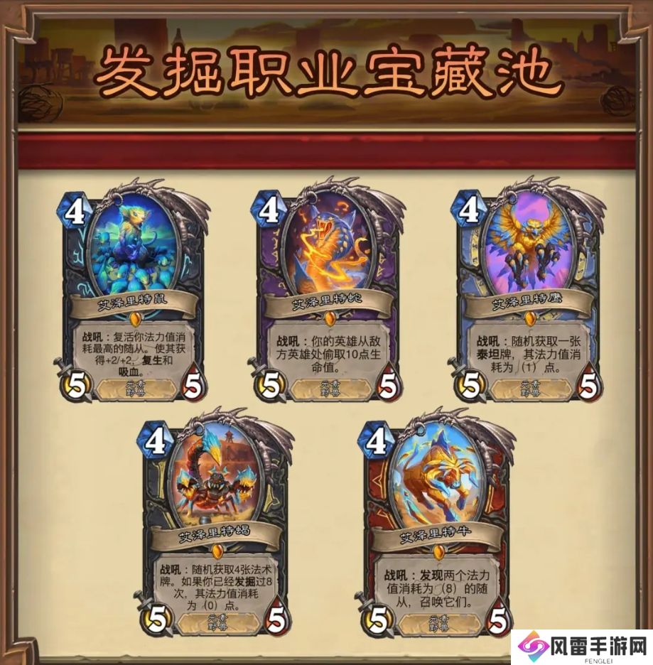 3、目前游戏中只有dk、术士、法师、潜行者、战士有发掘机制。通过发掘机制可以获得的卡牌如下所示: