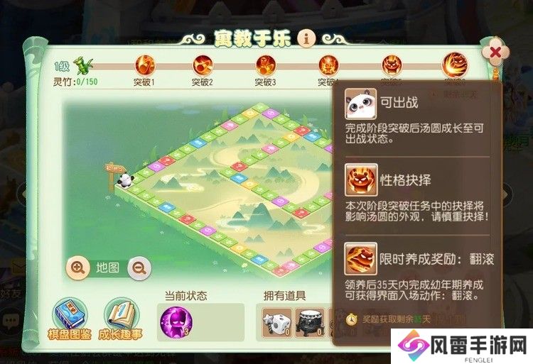 2、寓教于乐:幼年期养成期间,可以通过活跃度奖励、每日任务等获取养玉竹骰子,使用玉竹骰子参与寓教于乐玩法,即可帮助汤圆不断成长,解锁技能。