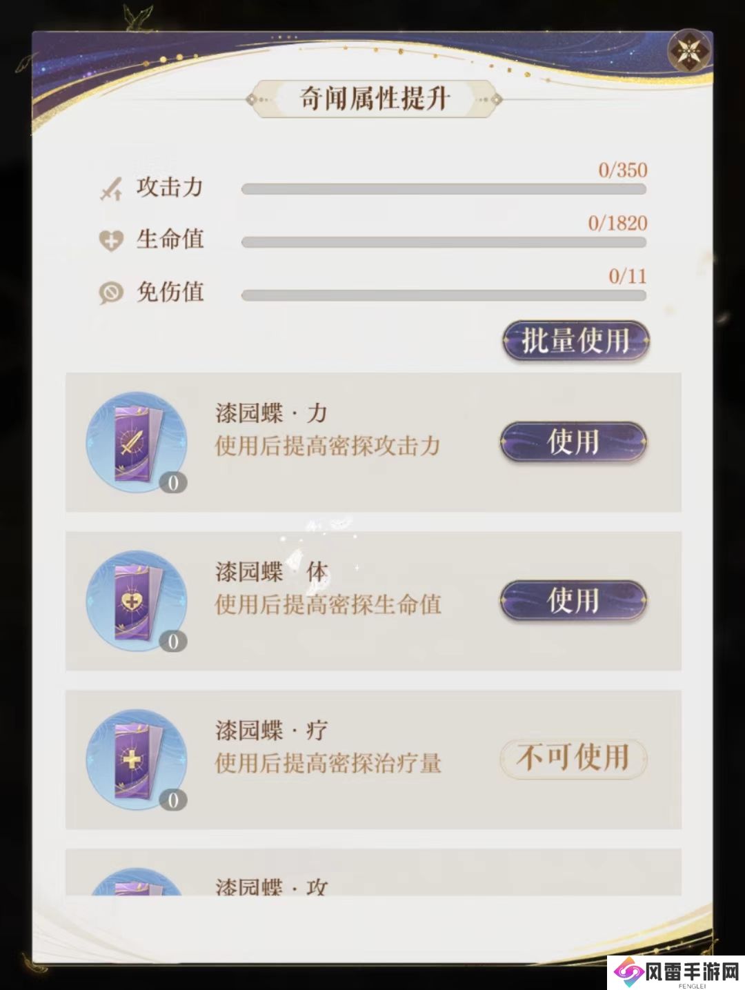 如果漆园蝶不够,小伙伴们也可以通过做鸢报去获取,每天都能够刷两次左右,此外还有一些道具可以恢复刷取次数,所以平时没事的时候,一些固定的次数任务小伙伴们还是要去做的,获得的东西后续基本上都要用到。