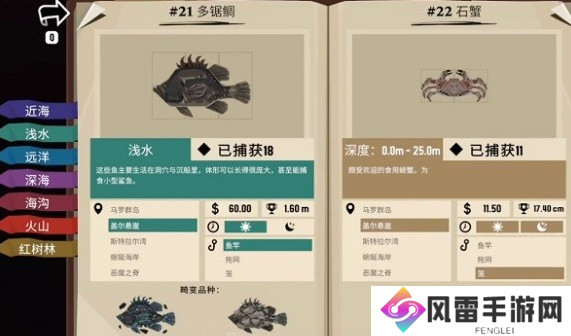 如果抓鱼时水花呈现的是五彩的颜色就证明捕捉到稀有的变异鱼种,如果是转盘中出现金色块我们就能捕捉到奖杯鱼,这个鱼除了能卖出高昂价格外,也会被记录到图鉴中,另外捕鱼时还要注意几个条件,那就是对应水域的捕捞位置、鱼类出现的地区位置,这些都可以通过图鉴来查看其中的一些讯息。