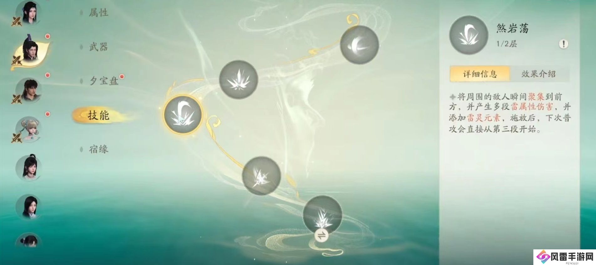 第2个技能是煞岩荡,将周围的敌人瞬间聚集到身旁,并生成多段雷属性伤害,同时添加雷灵元素,释放之后,下一次普攻将会直接从第3段开始。这样的好处是省去了普攻前两段的效果,直接打出第3段的伤害。这一技能效果可以和幽驹袭天很好地配合起来,将敌人吸过来之后直接开法阵快速清理掉。