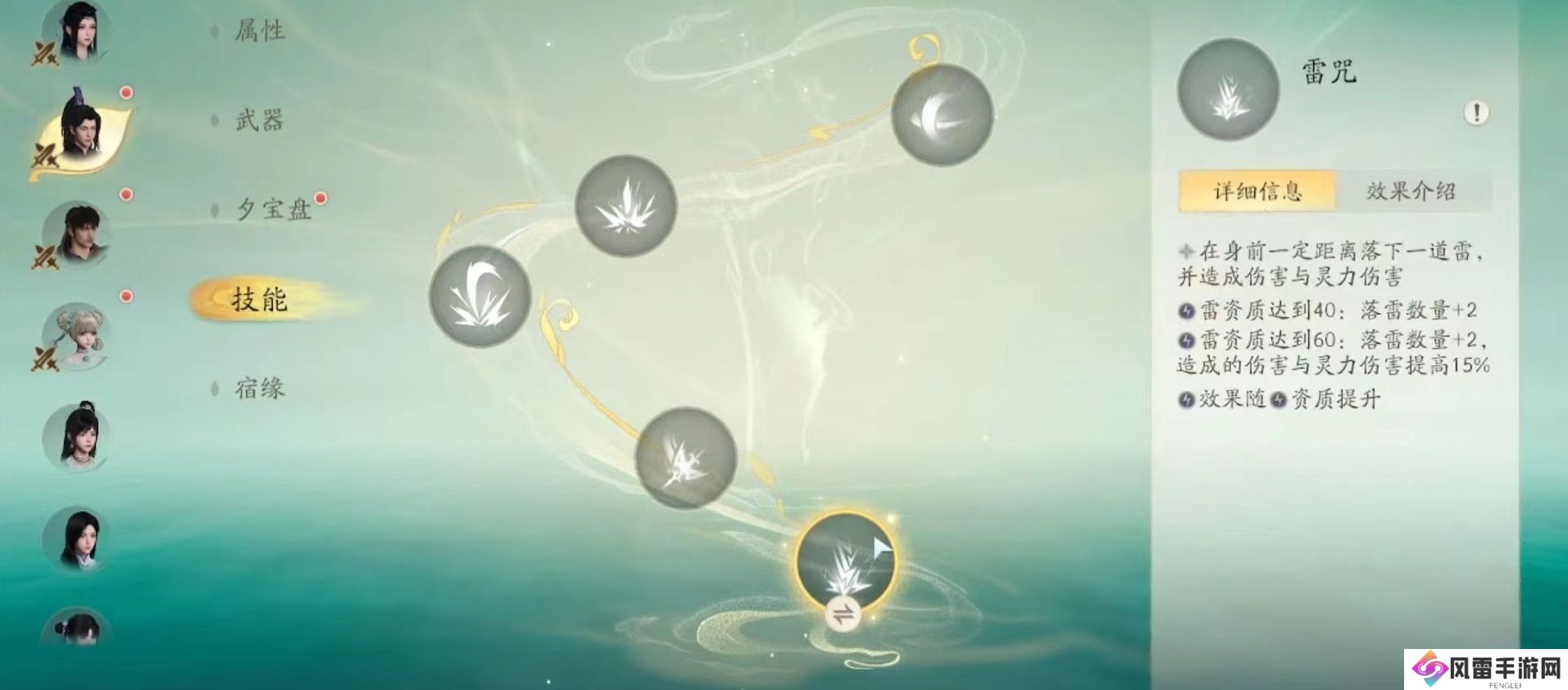 第3个技能是阴罗行,能够进行最多4段连续攻击,在第3段连击后释放连续点击普攻按键可以释放额外三段的连续攻击,该技能也可以触发下落攻击,从空中直接下坠对敌面目标造成伤害。第4个技能是雷咒,在自身前一定距离落下一道雷造成伤害,当雷资质达到40点时,落雷数量增加两道,雷资质达到60点时,落雷数量增加两道,并且额外提升15%的伤害。这一雷属性的角色在伤害方面还是很可观的。