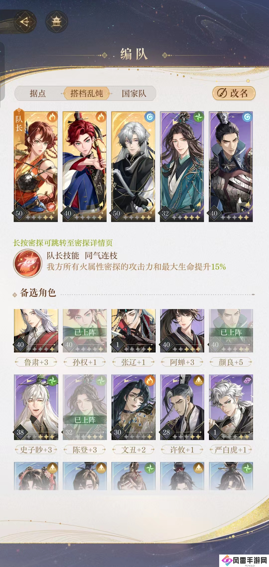 例如与孙尚香同属一个池子的孙权,由于孙尚香作为队长时可以增加当前队伍火属性密探15%的攻击力和生命值,因此选择同为火属性密探的孙权作为队友来进行搭配是一种很不错的选择。选择江东兄妹组来进行对战的时候,我们可以同时选择颜良,王粲和陈登一起对战。江东兄妹负责队内输出,颜良作为盾可以有效保护队内其他密探,陈登和王粲则可以为队伍提供一定的治疗辅助,是一个攻防兼备的组合。