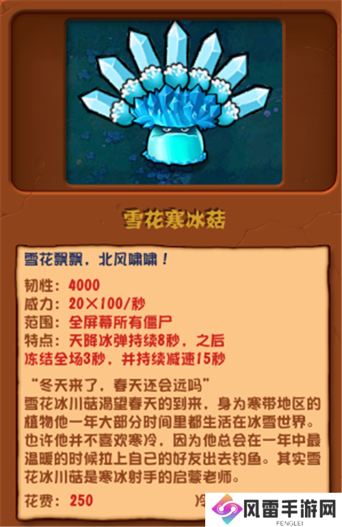 评价:8秒后冻结全场3秒,**僵尸来袭时的绝佳辅助。为其他植物创造更多输出时间。